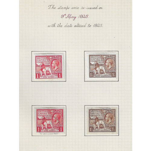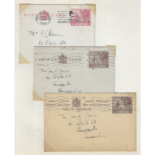 1924-25 Wembley useful range on leaves including both sets mint, and sets used (Cat £206), then postal stationery cards 1d used on 24th Apr, 1½d both used on 25th April, unused 1d, 1½d (2 diff). Mixed, (8 stamps, 6 P/S).