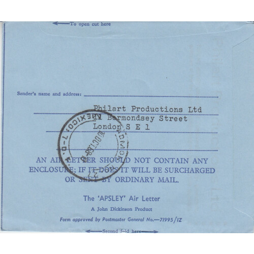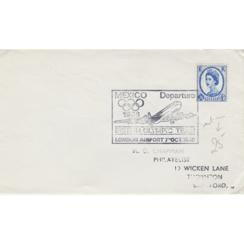1968 Airmail letter typed London-Mexico flight with special departure of British Olympic Team 7th Oct 1968 cancel. Mexico receiving cds on reverse. Plus similar cover with 4d. Unusual and rare items.