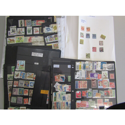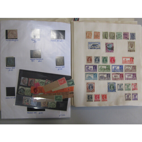 ALL WORLD Flat box with an all periods mint and used stash in packets, on cards, on album and stock leaves includes French & Southern Antarctic Terr mint on Hagners with better cat with Quiet Sun set 2, Siam earlies mint, Azad Hind perf & imperf labels, GB 24p forgery, revenues from foreign countries some in mint panes, Fr. Colonies, world colln on leaves, etc. Good little sorter, 100s.