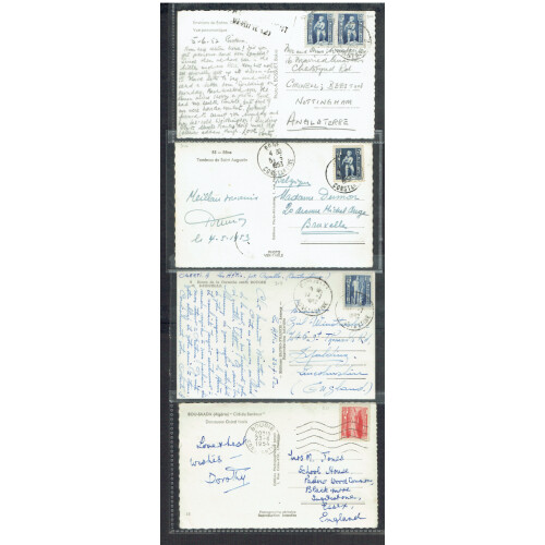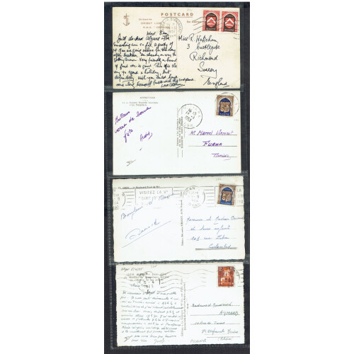 1920s to 1950s useful group of picture postcards bearing many attractive combinations of defins and commems noted 1958 Foundation Marechal De Latre with photo of Marechal and stamp affix tied special cancels on obverse, 1952 similar special cancel for Bir Hakeim 1942 tied on obv., 1950 Foucould & Laperrine stamp tied on obv., 1954 Lavellette, intr group. (18).