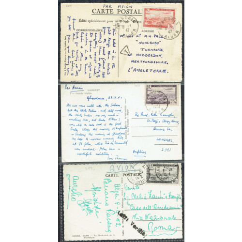 Group of Covers (17) mainly 1920s-1949 noted WWII censors (2), PPCs for 1920s to 1950s (9), 1945 Creased CONTROLE DES INFORMATIONS two line violet boxed h/s with airmail crossed out (no air service), 1945 cvr from Phillipville regd locally, 1945 cvr from Guyotville, 1949 advert cover for Joseph Perrin importer from Birtouta, etc (17).