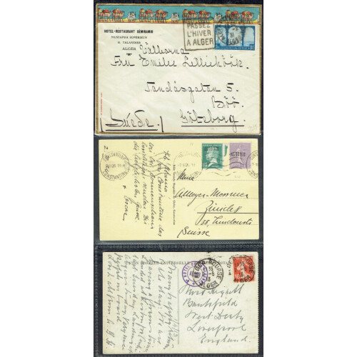 Group of Covers (7) mainly 1920s-1949 noted WWII censor, 1931 colour illus Hotel env., 1926 multi franked nine Algerie defins, 1931 Uruguay to Algeria with postage due combination, 1949 Oran fine wines illus postcard, 1913 PPC with French 10c Sower tied GER BOUSE ALGER cds. (7).