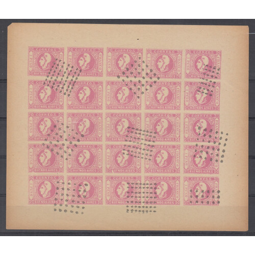 1859 Buenos Aires 1 Peso pink and 2 Pesos blue SPIRO forgeries in COMPLETE SHEETS OF 25 with usual dotted square cancels. Some peripheral toning to edges of sheets actually adds to the superb appearance of these items. Would display very well (2 sheets)