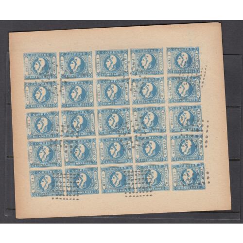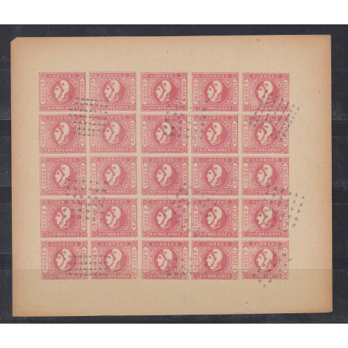 1859-62 Buenos Aires 4R green, 1 Peso blue and 2 Pesos red SPIRO forgeries in COMPLETE SHEETS OF 25 with usual dotted square cancels. Some peripheral toning to edges of sheets actually adds to the superb appearance of these items. Would display very well (3 sheets)