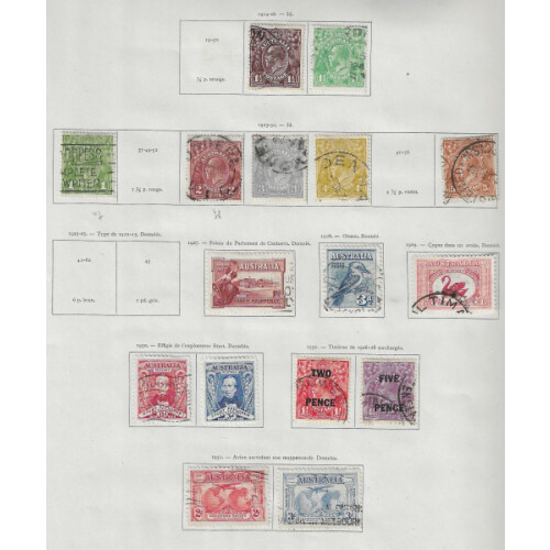 Collection of small ranges on Yvert printed leaves with three better stamps noted 1916 Narrow Crown 1s blue-green mint (Cat £70), 5s grey and yellow very fine used (SG 42 Cat £120), 1932 C of A 10s grey & pink very fine used cds (SG 136 Cat £160), other Roos to 2s maroon, GV heads to 1/4d used, 4d violet mint, 1935 SJ set mint, 1934 Macarthur set 3 mint, Centenary set 3 mint, Officials 1929 Air OS perfin mint, nice little lot. (c80).