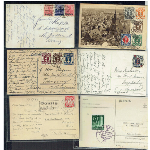 Covers (2) and PPCs (10), useful group for mainly 1920s period many with 10f green Arms, 1927 cvr to London with multi franked combn, 1923 50,000 green blk 4, 20,000 blue tied DANZIG LUFTPOST oval cancels to Lwow in Ukraine, 1920 photo postcard of swimmers on a beach with Danzig ovpt on Reich combn etc, nice group. (13).