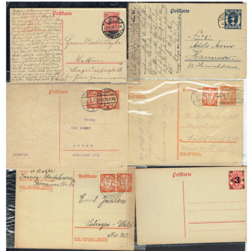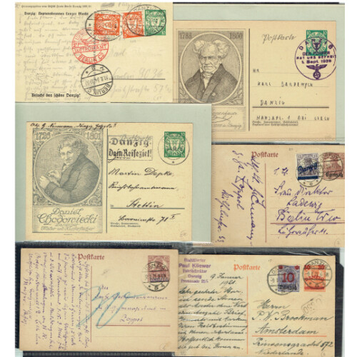 Postal Stationery collection useful group of used (14), and unused (6), better incl. 1934 Berlin C2 red flight cachet with DANZIG LUFTPOST ovals, 1939 Der Fuhrer 1 Sept 1939 cancel on Schopenhauer illus card, 1920 Zoppot to Berlin, 1921 surcharges combination, 1939 Zopport Frei Stadt Danzig, etc, nice group. (20).