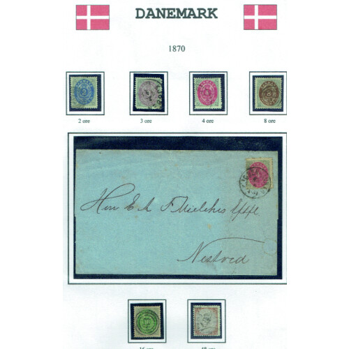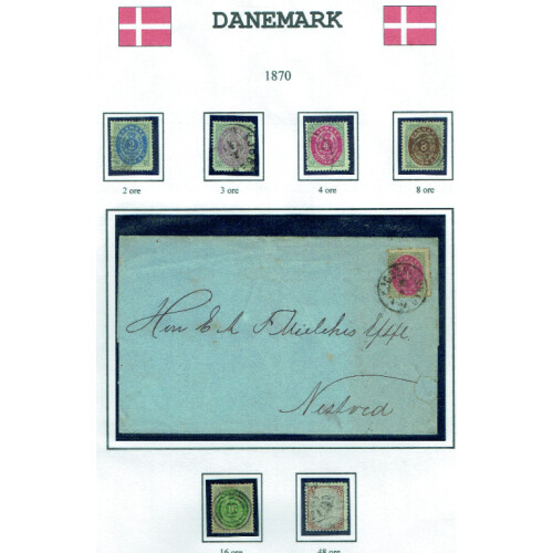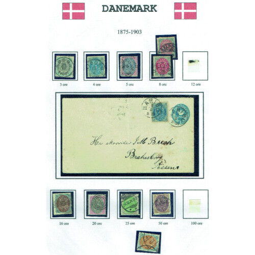 1854-1903 Classics assembly on album leaves with single used examples (mainly fine) and seven covers including 1857 E/L Nakskov to Copenhagen tied 43 numeral cancel with 4s yellow-brown, 1867 4s brown Flensburg, 1863 4s brown Sevendborg to Copenhagen, 1864 4s red on E.L., 1894 4s blue P/S env uprated 4p tied MARIBO CDS's to Assens, Officials 1871 4s red on cover, then 31 stamps from the period incl 1853 set to 16s (rated $320), 1858 4s & 8s f.u., 1864-88 set to 16s (minor perf faults, Scott $388), 1870-71 2sk to 48s (Cat $660), officials 16s green (P.14 x 13½, Scott $350). Useful and attractive assembly.