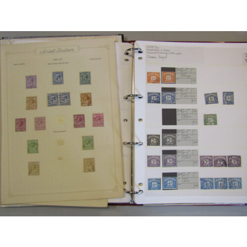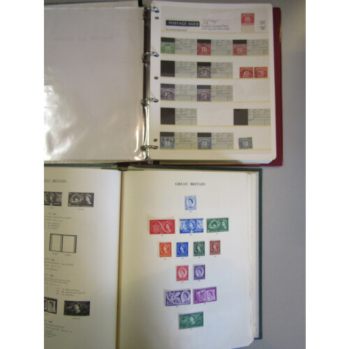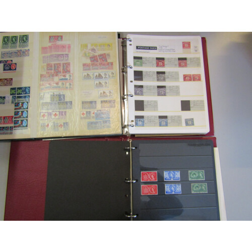 Accumulation in various albums and stockbooks with good range of material including useful 1950-1960s Commems mint in sets and identified minor varieties (many), Windsor springback album with QV-QEII colln incl mint QEII and few used QV onwards, regionals, remaindered but good qty left, Wilding set on stockpage, Graphite's set mint, Frama set of values to 16p mint, 1974 1p & 1½p self-adhesives, Postage dues binder with vals to £5, pre decimal on paper incl 2/6 in blocks, stockbook with jumbled Wildings mint for different printings incl blocks of 4, 6 or 8, Tudor or Edward Crowns, then later Multi Crown to 1/6 duplicated mint, some cylinder positionals up to 1/6, Sterling Machins incl large mint blocks, QEII commems incl blocks mint from 1953 Coronation onwards, Utile springback incl 1939 set 6 used, 1948 RSW set used, GVI incl few control mint blks of 4, large binder of Decimal Machins mint identified, etc, huge amount of material, 100s.