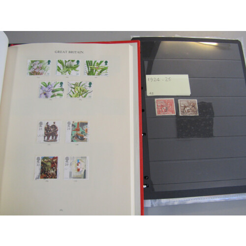 HEAVY well filled box with a good range of collections including Windsor albums for middle to modern, on leaves and stockpages, some earlier QV onwards, few covers etc, ideal sorter, 100s.
