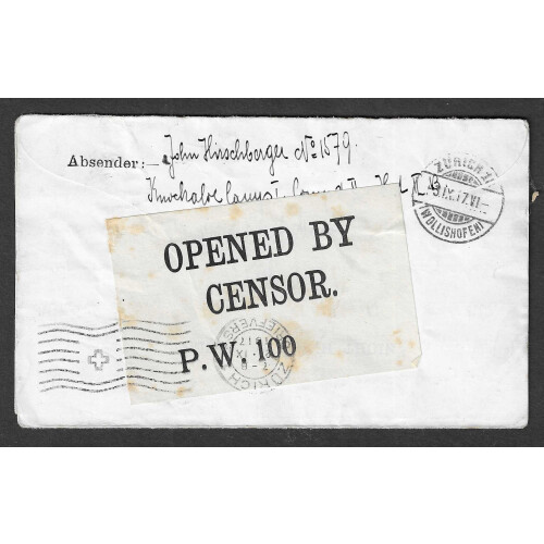 1917 Printed Prisoners of War Mail WWII white envelope (No Stamp Required) from Knockaloe Camp IOM addr to Zurich from POW in Peel IOM, with reverse OPENED BY CENSOR P.W. 100 label with transit and arrival Swiss backstamps. Few light tones and wrinkles otherwise sound.