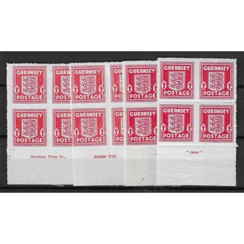 1942-43 1d scarlet Imprint blocks of four mint / U/M for different printings including 8th, 9th, (Guernsey Press Co.), 13th (Press Typ.), 14th ("Press") & 15th printings all fine. (4 blocks of 4).