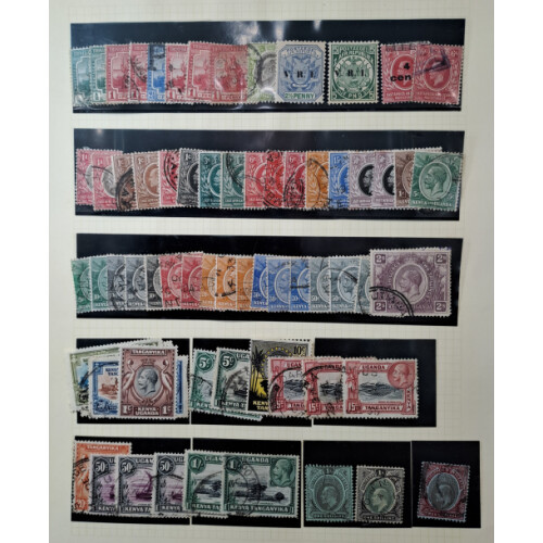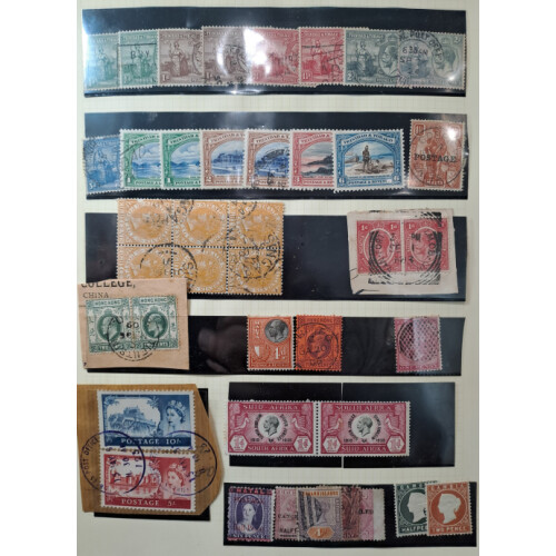British Commonwealth - old time auction folder with useful GV ranges both mint and used incl St Helena 1922 to 1s cds used (Cat £56), India 1928 15r used Bombay airmail (SG 218), Straits Sett. 8c yellow used blk of 6 (SG 52), Hong Kong EDVII 2c green pair tied TIENTSIN cds (fine), EDVII 4c with Canton cds, Br. Africa incl S. Nigeria to 2/6, Transvaal £5 reprint mint, etc.