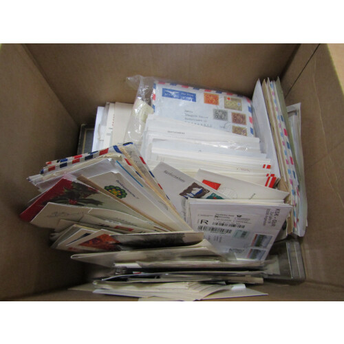 Accumulation in TWO boxes with country sections in folders for European areas, Liechtenstein FDCs duplicated stock in shoebox, large accumulation of postcards and FDCs including Austria, Germany, EUROPA sets, Switzerland, ideal for online seller etc, 100s.