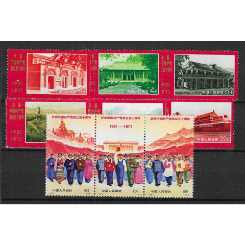 1971 50th Anniv. of Chinese Communist Party set of nine including the strip of three unused without gum, heavy hinges and removal making poor thinning and damage to the back, SG 2446/2454.