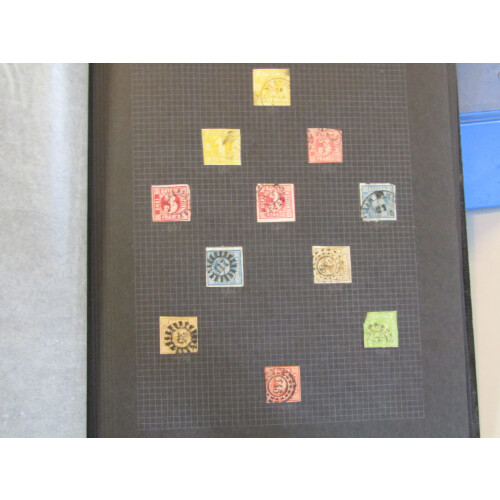 Bavaria: Nice collection mint and used neatly assembly in black springback album on black faced leaves some mixed condition as usual includes Imperfs mainly for shades 1849 imperfs 3k blue (3), 1850-58 1k pink, 6k brown (3 shades), 9k green (3 shades), 1862 1k yellow (2 shades), 3k red (3), 6k blue (2), 9k (2 shades), 18k red (Cat £225), 1867 6k bistre, 6k blue, 18k red (Cat £275), 1911-13 values to 20m chocolate on yellow (Cat £220+), Type II to 2m, 1914-20 King Ludwig sets complete mint, some used, etc, ideal lot for expansion.