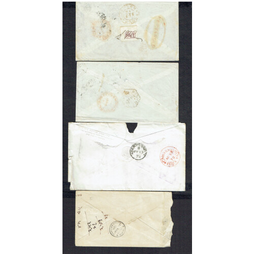 Commercial covers from Queen Victoria era (8), including 1867 to London from Calcutta bearing 1a brown strip of 4 and addl trio making 7a rate tied blue CALCUTTA cds cancels (heavily torn), 1872 INDIA PAID cvr to Wales bearing 8a & 2a tied barred cancels (torn), 1864 two ½a single rate covers, 1889 multi franked torn cover, etc. Very mixed condition but intr lot. (8).
