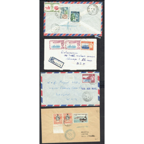Group of covers from GVI/QEII includes nice multi franked covers, noted 1953 two SS IONIAN LEADER / PANAMA oval cancels to USA, 1951 two double ring KINGSTON / 2 cds cancels, 1960 SIGN regd airmail to UK, 1960 multi cancelled THREADWAYS on reverse, 1961 RUNAWAY BAY, 1959 ZURICH SHIPPING cachet from Kingston with M/S Sundele with St Pierre & Miquelon adhs affixed but not tied. Very mixed but useful group of 8 covers.