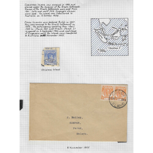 Perlis: 1955 Bailey cover bearing 2c orange pair tied by complete COCOS ISLAND Nov cds cancel. Fine. Coos Islands were transferred to Australia in Nov. 1955.