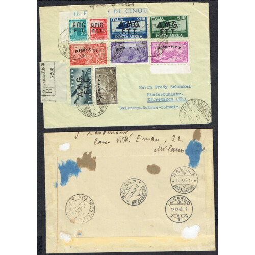 1948-49 Two attractive combination covers incl 1948 Philatelic Congress cancels on AMG FTT airs set of six regd to Switzerland, 1949 covers with sixteen defins and airs to 50l, sent philatelically. Nice duo.