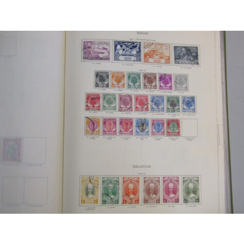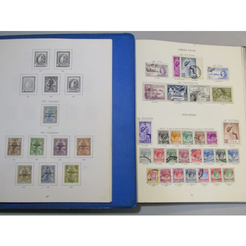 BRITISH COMMONWEALTH: Carton containing SG GV1 printed album with a comprehensive used collection with many complete country sections inc. Ascension, Antigua, Basutoland, Br. Guiana, Br. Honduras, Cayman Is., Ceylon, Cyprus, Dominica, F. I Deps, Gambia, Gibraltar, Gold Coast, Grenada, KUT, Leeward Is, Malta, Nigeria, Papua, Penang, Pitcairn Is., St Helena, St Kitts, Singapore, Sierra leone, Straits Settlements, Tuks & Caicos, Br. Virgin Is. & Zanzibar, many countries with only Postage Dues missing inc. Barbados, Br. Solomon Is., Fiji, Gilbert & Ellice Is., Hong Kong & Trinidad & Tobago plus most Omnibus sets inc. RSW plus much more with better sets throughout. Album is fine although some tone spotting is noted. Also inc. an album of mainly QE2 used Malta plus a stockbook with sparce ranges with the odd better. Huge cat value (100s)