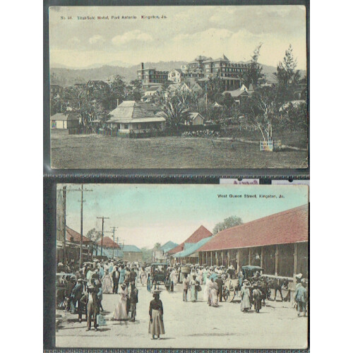 Maritime: Jamaica 1910-13 Two postcards POSTED ON THE HIGH SEAS violet ovals with EDVII 1d tied CARTEGENA d/s, 19193 GV 1d tied PAQUEBOT / KINGSTON - JAMAICA cds and ROYAL MAIL STEAM PACKET violet oval alongside. (2).