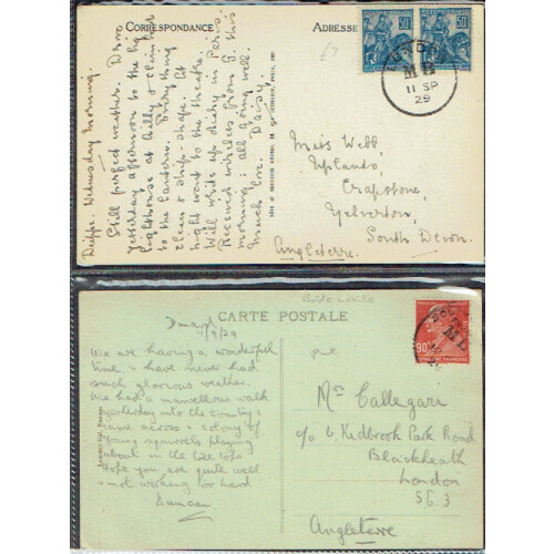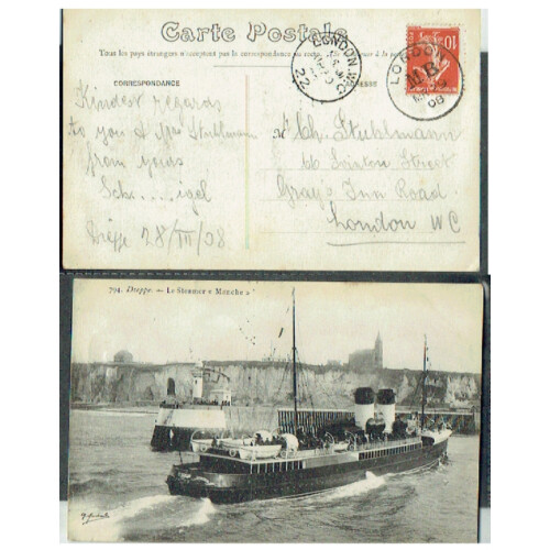 Maritime: Moveable Box 1906-13 Four PPC's to London bearing France adhesives each tied by LONDON / M.B. cds cancels. Moveable Boxes (or boite mobile) on board private ships we used through a special agreement between France and Britain for mails since 1856 and the service became so successful that moveable boxes were employed to process the mail carried by private ships at a cost of One Penny. Includes two later or part cancel example. (6).