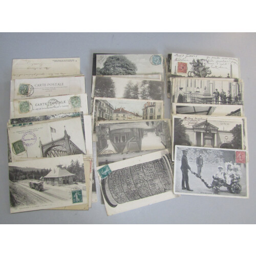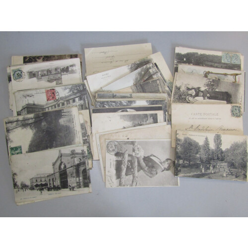FRANCE: An extensive used assembly in a shoebox from an original correspondence of circa 1900-1920 PPCs, portraits, greetings, places and districts. All with postage stamps used variety of Sowers, Blanc defins at postcard rates in France, 1914 Arrival of the Turkish military, 1906 Big Wheel Paris, 1903 Vittel Water Source, pretty much all different. Approx 435, nice original correspondence