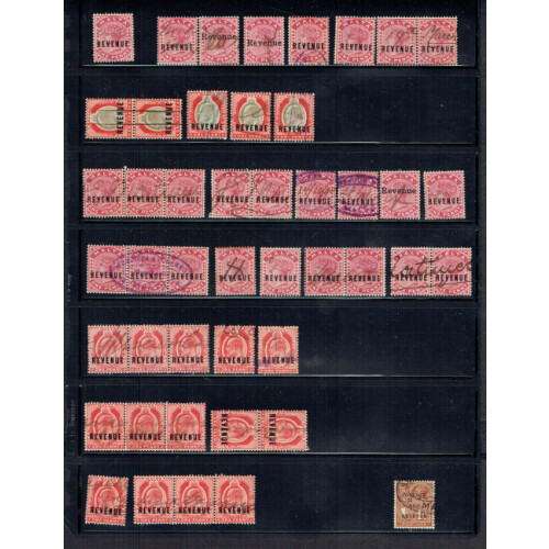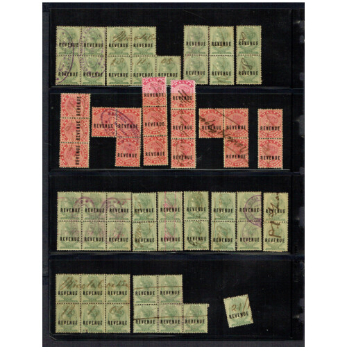 MALTA: QV-GV Heavily duplicated range of mainly QV low values for ½d green and 1d carmine used includes Revenue or REVENUE overprints some in blocks of 4 or 6, 3d on 1s violet (13), 4d & 1s, EDVII to 3d, GV incl Registers ½d pale violet one with blank tablet plus 3d carmine. A few normal QV issues with nice cds postmarks. Good qty (approx 210).