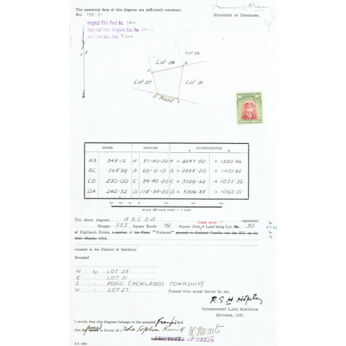 Southern Rhodesia: 1920s GV Five Deeds of Transfer documents bearing 1924 revenues 10s green and red tied by registrar or high court datestamps. Barefoot 3 & 4, plus 11 & 12.