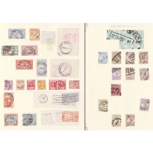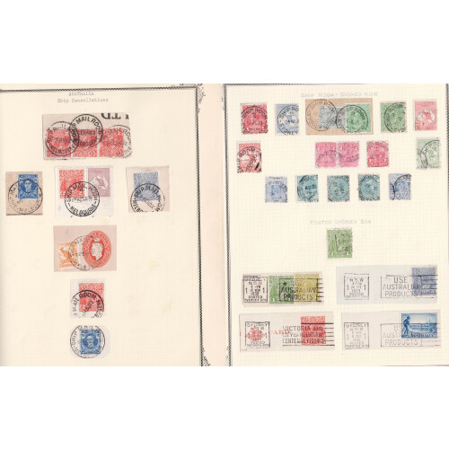 Postmarks: Mainly GV collection identified on leaves with many useful cancels arranged by types on GV heads or Roos noted amongst others Railway for NSW, Victoria, S. Australia, TPO Numbers, Railway stations, Posted on Train, Matung Railway, St Kilda railway, Ship cancels, Maritime, English Mail TPO Out to 5s, Paquebot cancelled at Wellington N.Z. incl WN dumb cancels, Paquebot cancelled at Honolulu (19), Colombo (6), Singapore (4), USA (5), Loose Ship Letter on different Fr. Colonies, Fiji, Neth. Indies, Papua, Hong Kong, LATE FEE, Relief Numbers, M cancels used after numerals exceeded 1000, (M8, MCC, MD29, MC33), Parcels large ovals incl 1s roo blk of 5, 2s brown (3), Money Order cancels, Telegraph cancels. Superb and interesting lot with approx. 470 items. Ideal for expansion.