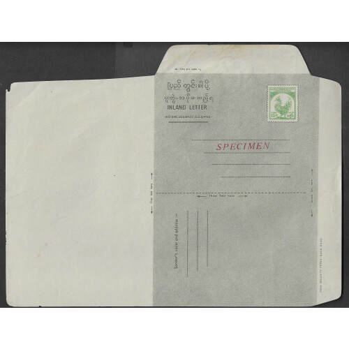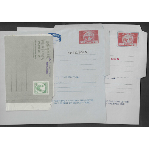 Unused Airletters, group of four examples incl 1954 15p green with AIR LETTER / AEROGRAMME two line h/s in violet, 15p green with red SPECIMEN overprint, 50p red Globe and flying bird two examples with SPECIMEN overprints in black or red (2 different types). Very fine.
