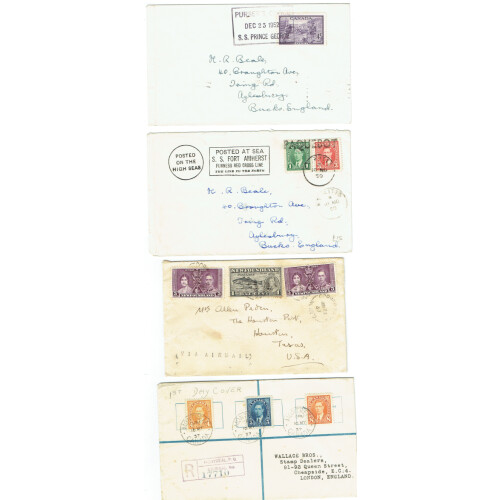 1937-1952 Four covers incl 1937 defins FDC, 1937 Coronation commercial cover to USA, 1950 SS Fort Amherts and SS Prince George both POSTED AT SEA or PURSER'S OFFICE, few marks or tones. (4).