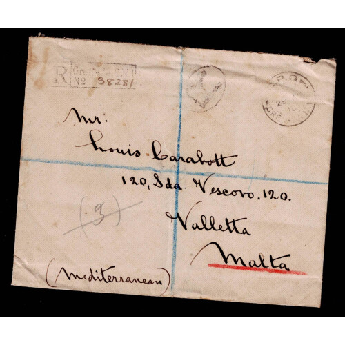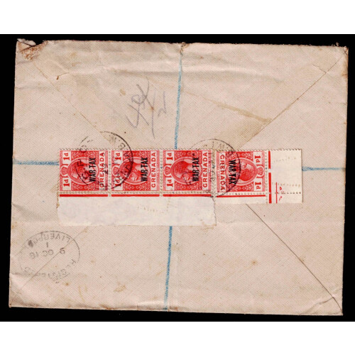 1916 Registered envelope (faults) to Valletta, Malta bearing WAR TAX 1d scarlet vertical strip of 3 and additional 1d single with various extra perfs on angles in the margin tied GPO GRENADA cds's. SG 111.