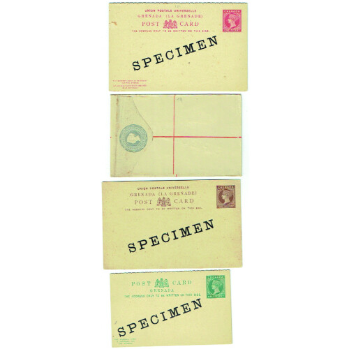 SPECIMEN Overprints on twelve items incl QV ½d green, 1d red & 1½d brown single cards, 1d red & 1½d brown newspaper wrappers, 2d grey registered P/S env., EDVII ½d green and 1d red newspaper wrappers, GV 1d red card, GVI 1d purple env., 5c purple env., 4c red single card each with SPECIMEN diagonally across the centre in black on both sides. Nice group of 12 Specimen items.