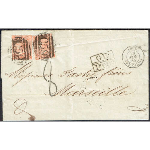 Great Britain Used Abroad: 1865 Entire Letter (flap torn) Jacmel to Marseille bearing GB QV 4d vermilion plate 14 PAIR tied two good strike of C59 duplex cancels, along with 8 h/s chargemark and boxed GB / 1F60c accountancy mark and AMB CALAIS transit. Reverse shows JACMEL / A cds and various French transit and arrival backstamps via London. Accompanied with 1991 RPS certificate.
