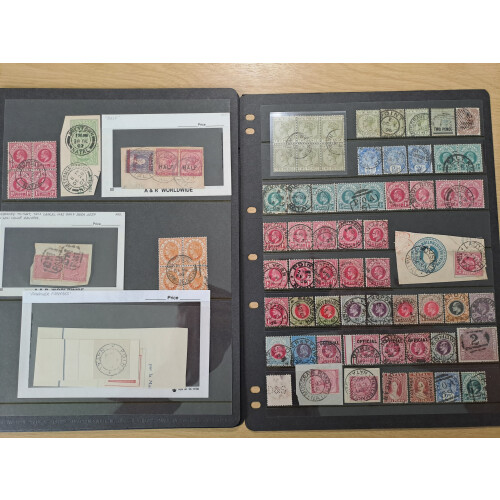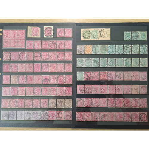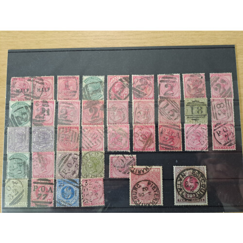 Postmarks collection: Attractive balance of a lot of over 90 QV/EDVII low values to 5s rose defins each with double ring cds, numeral cancels, POA numbers, dotted, EDVII Postage & Revenue 10s cds, plus other types with some light duplication neatly arranged on Hagner page. Superb lot. Approx. 90+.