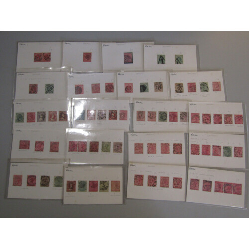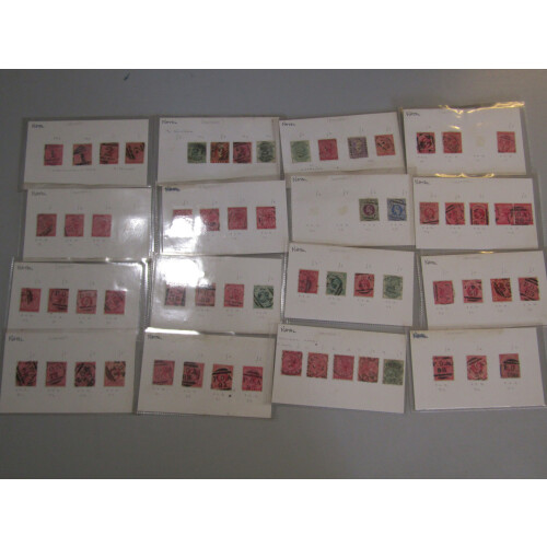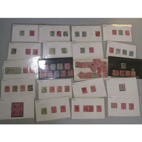 Postmarks: Queen Victoria collection of old time priced up cards with postmarks identified mainly QV low values with dozens of useful and different including numbered P.O.A. cancels, duplex numerals, CDS towns and villages, noted Umzinto, Tongaat, Thornville, Ixopo, Mid-Illovo, FPO Br. Army P.O., dumb strikes, NFP negative cancel, Isipingo, Howick, Sunday's River, plus many more. Approx. 210+.