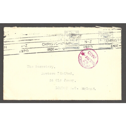 1920 (18 Dec) 1d postage paid Christchurch impression x 2 on cover to London cancelled Christchurch roller cancel and London PAID CDS on arrival, nice early meter mark in grey-black.