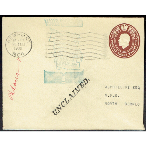 1938 Philatelic GB 1½d brown embossed envelope to GPO North Borneo sent philatelically from Newport with Jesselton arrival backstamp and UNCLAIMED h/s on obverse and Mil for Return h/s's alongside. Intr.