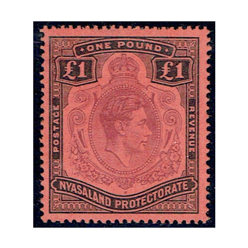 1938-44 £1 purple and black on red hinged mint showing Serif on G variety, fine, SG 143c.