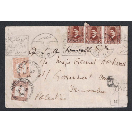 1934 (13 Apr) Incoming cover from Cairo to Government House in Jerusalem bearing 5m brown strip of 3, underpaid with Palestine Postage Dues 1m & 6m tied JERUSALEM cds cancels. TO PAY 7 MILS h/s bottom right, badly torn on reverse addr to Major General A P Wavell who was based at Govt House in Jerusalem when he commanded British Forces and Transjordan in 1937 who later became Viceroy of India. SF D12 & D15.