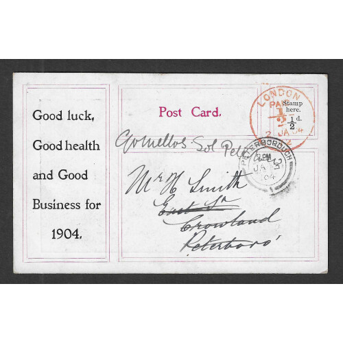1904 (2 Jan) Naptha Distillery London black and white printed postcard to Peterborough bearing LONDON PAID ½ / dated circle in red, nice 'mailer card' with brewery theme.