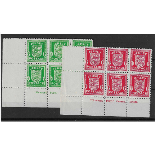 1941-42 Two bottom left corner imprint blocks of 6 ½d bright green Evening Post Jersey January 1942 and 1d scarlet Evening Post Jersey 17/3/41, both mainly unmounted mint, fine for these, nice positional pieces. SG 1/2.