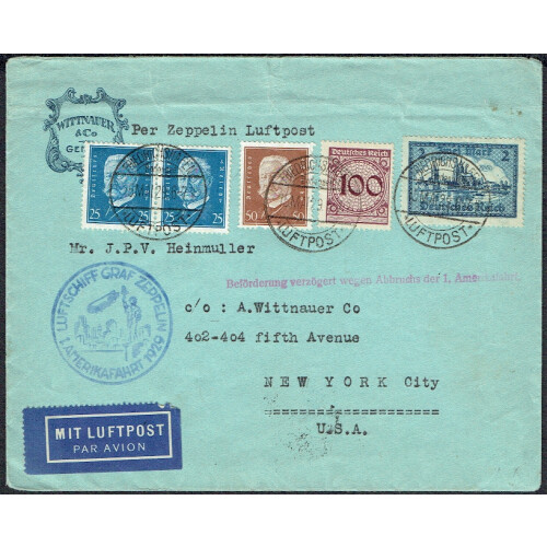 1929 (15 May) Airmail LZ127 1st America flight - Cover to USA bearing Germany multi franked combination tied FRIEDRICHSHAFEN / LUFTPOST cds and LUFTSCHIFF GRAF ZEPPELIN cachet in blue, single line Beforderung verzogert wegen Abbruchs der 1. Amerikanfahrt handstamp in red (Delayed due to cancellation of the first trip to America, the flight finally left on 1st August). 5th August receiving backstamp. Few creases. Sieger 27 (A).