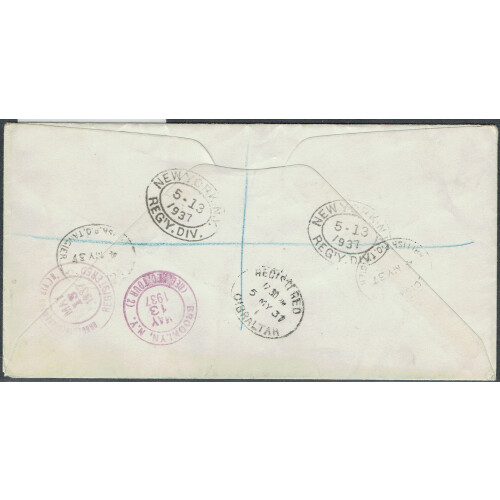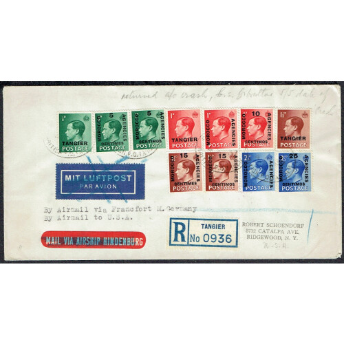 1937 (4 May) MAIL VIA AIRSHIP HINDENBURG - Registered cover Tangier to New York originally for airmail transport on the Hindenburg but both airmail and label crossed out in blue crayon and returned to the sender bearing a multi franked GB EDVIII ½d (3), 1d (3), 1½d (3), 2½d (2) tied REGISTERED TANGIER oval cancels. Possibly intended for flight on the Hindenburg which crashed on 6th May 1937. It crashed and burned at Lakehurst Naval Air station attempting to dock. The cover could not be carried on the ill fated ship so it was returned to Gibraltar, backstamped GIBRALTAR 5th May REGISTERED oval and further conveyed by normal means after arriving in New York on 13th May. Unusual and interesting.