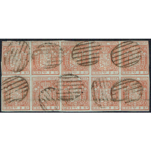 1854 Thin bluish paper: 2r dull red in a magnificent fine used block of ten with margins in most places, (touching in two parts) neatly cancelled with PARILLA barred ovals in black, expertised Pedro Monge handstamp on reverse, very scarce multiple, few offered on the market, Scott 34a. Cat $6000 plus premium as a block ($12,000+)