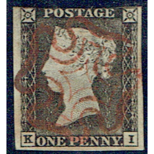 1840 1d grey-black (KI) worn Plate 1A, attractive three margin example with neat red MX cancel, fine.