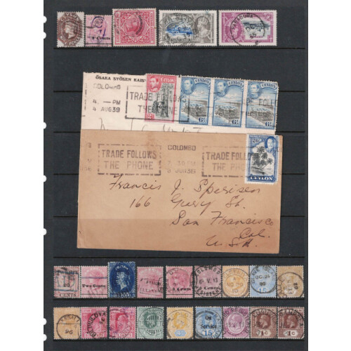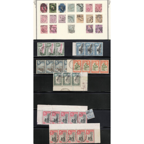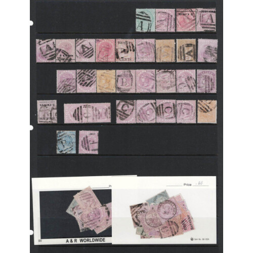 Postmarks: Extensive collection on Hagners, packets, cards and loose for QV-GVI issues including 1863 vals to 1s violet incl A or B, C, F duplexes 9d brown, 10d vermilion, F duplex on 6d brown, dozens of QV cds towns, duplex, numerals, GVI in strips and blocks with wavy line town cancels, GV cds cancels with many different, Forwarded, PAID, CC, duplication and mostly good numeral strikes on many different QV stamps. (Approx. 550+).