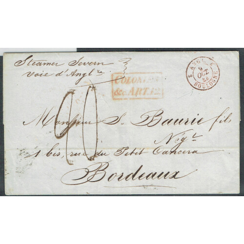 Great Britain P.O. Abroad: 1844 Entire Letter Havana to Bordeaux with neat HAVANA double arc d/s on reverse, sent Steamer Severn, and manuscript 40c charge mark, boxed COLONIES & c ART 12 in red treaty mark alongside. Sent via London, small faults. Crisp Havana cancel.